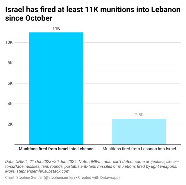 以色列向黎巴嫩發射了至少11,000枚彈藥。