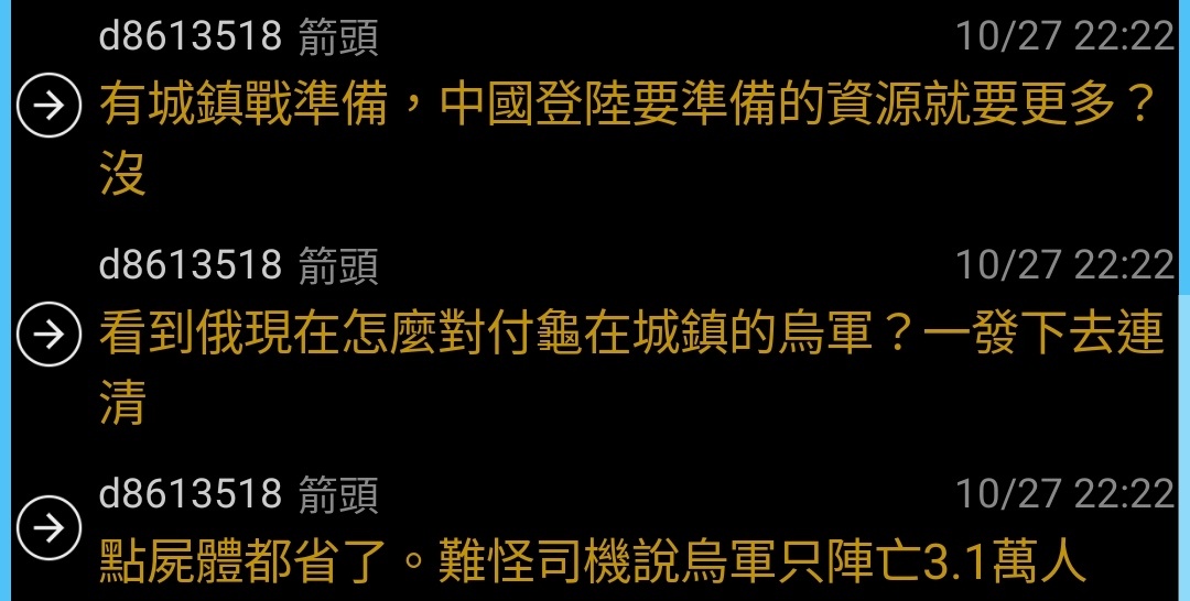→ dragonjj : 追擊方慘結果一樣放上俄方每天死亡千多人講白點根 10/28 10:23