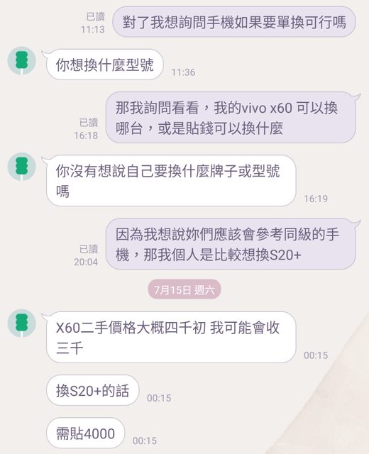這個是手機店的推銷員 然後我就隨便回了一個換S20+ 然後說X60換S20+要給4000 我想說奇怪這兩台不是同等級的手機嗎 X60還晚了一年 https://i.imgur.com/5JhzivP.jpg