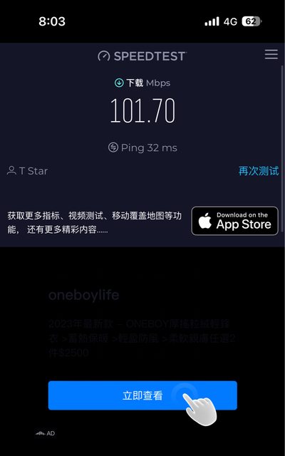 測試點:捷運新店市公所 小弟是雙11 188不限速吃到飽 終身優惠的釘子戶. 目前的連線速度,是用台灣之星以來最快的速度!非常滿意 也感謝台哥大的繼續照顧! 充滿感恩!耶! -- ※ 發信站: 批踢踢實業坊(ptt-club.com.tw), 來自: 1.200.83.89 (臺灣) ※ 文章網址: https://ptt-club.com.tw/MobileComm/M.1700223131.A.26D