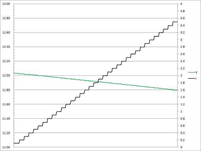 ▼USB-C1單獨使用下固定檔12V輸出負載測試,隨著電流增加,輸出電壓下降,輸出電流