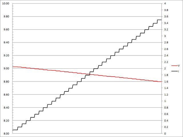 ▼USB-C2單獨使用下固定檔9V輸出負載測試,隨著電流增加,輸出電壓下降,輸出電流超