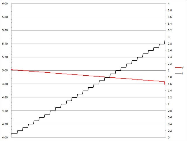 ▼USB-C2單獨使用下固定檔5V輸出負載測試,隨著電流增加,輸出電壓下降,輸出電流超
