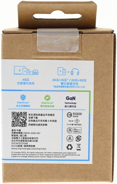 ▼外盒背面有單孔/多孔輸出功率、InnerShield安全保護機制圖示、GreenSense環保節能