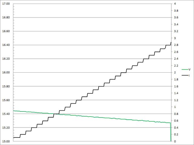 ▼USB-C2單獨使用下固定檔15V輸出負載測試,隨著電流增加,輸出電壓下降,輸出電流