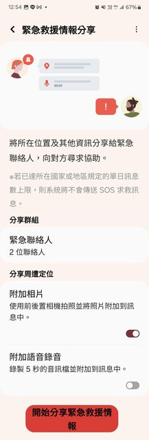 找了設定裡面的緊急救援情報分享功能,也沒有可以關閉的地方