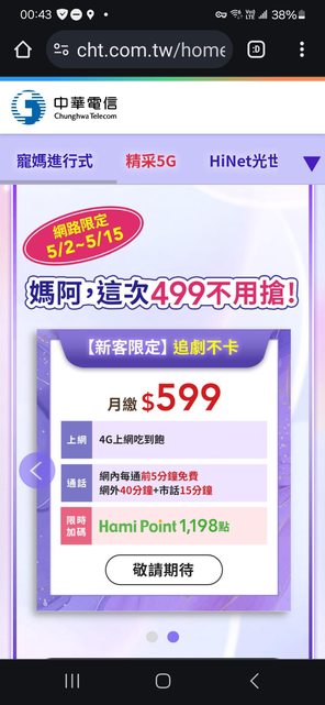 : 目前已續中華4G 月繳599,4G不限速吃到飽(原本合約是大4G月繳199 2024.06合約到期