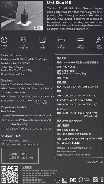 標題[心得] Avier Uni Dual45 GaN快速充電器
