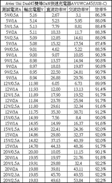▼USB-C單獨使用下各組輸出轉換效率表,整體輸出轉換效率在86.3%至92.3%之間