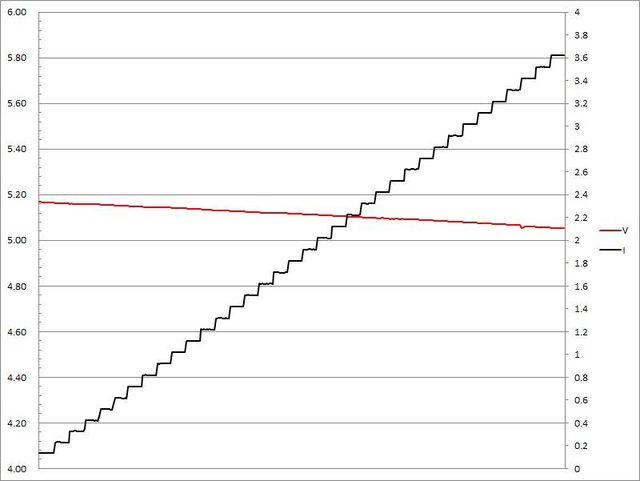 ▼USB-A的5V輸出負載測試,隨著電流增加,輸出電壓上升,輸出電流超過3.4A壓降,超