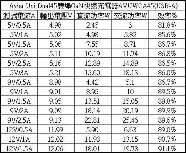▼USB-A單獨使用下各組輸出轉換效率表,整體輸出轉換效率在81.8%至91.1%之間