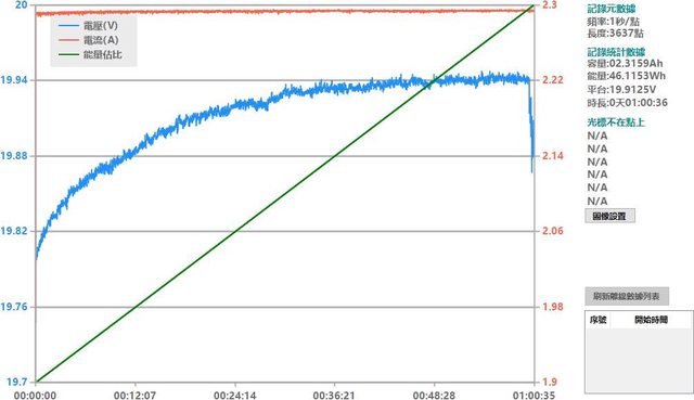 ▼USB-C搭配5A線材的固定檔20V輸出負載測試,隨著電流增加,輸出電壓下降,輸出電流