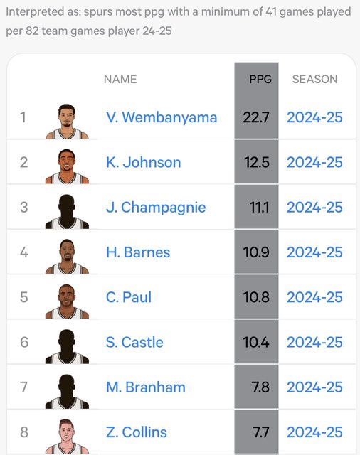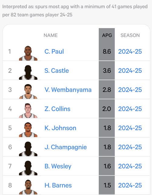 其他馬刺球員場均助攻次數均低於2