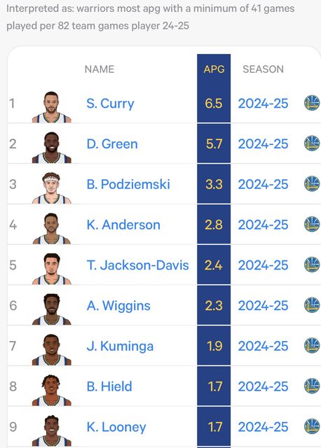其他勇士球員場均助攻次數均低於2.5