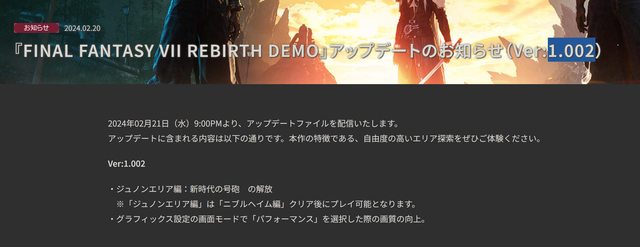 2024年02月21日(水)9:00PMより、アップデートファイルを配信いたします。 アップデートに含まれる内容は以下の通りです。本作の特徴である、自由度の高いエリ ア探索をぜひご体験ください。 日本時間九點起,台灣就是晚上八點起吧? Ver:1.002 ・珠諾地區篇:新時代的號砲開放 ※「珠諾地區篇」需先完成「尼福爾海姆篇:英雄賽菲羅斯」之後才能進入遊玩。 ・在畫面設定中模式中選擇「效能模式」時提昇實際畫質。 可以操作克勞德、蒂法、艾莉絲、巴雷特、赤紅13五人。 https://i.imgur.com/P885K0W.gif