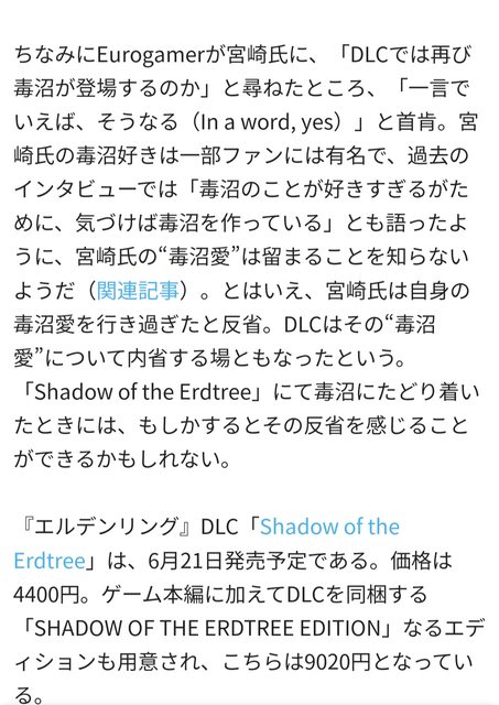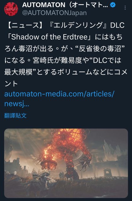 海外媒體詢問英高, 「DLC中會再次出現毒沼嗎?」 英高: 「一言以蔽之,是的當然有。」 宮崎英高對毒沼的熱愛眾所周皆知, 過去的訪談中他曾表示: 因為太喜歡毒沼, 所以會在不知不覺中就開始製作毒沼。 看來,英高對毒沼的熱愛沒有止境。 然而, 宮崎英高也反省過自己對毒沼的熱情, 可能真的有些過頭(所以做出了反省後的調整), DLC也成為了他反省這種「毒沼愛」的試金石。 或許在《黃金樹幽影》中再次探索毒沼時, 我們可以感受到,他反省的成果如何。 http://i.imgur.com/EmOyPPv.jpg