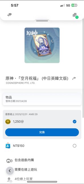 現跟推友搜尋原神月卡150元的那個,卻沒有顯示PSN的獎勵。