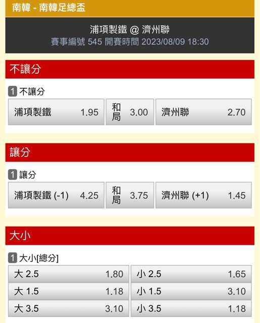 副推:濟洲聯3+(7.00)、全場大3.5(3.10)