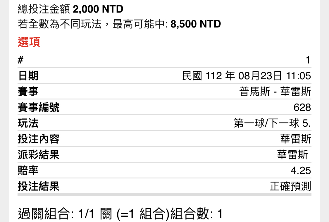 → Taiwan007: 剛那場買上半1.5大就不踢 42.77.32.178 08/23 11:41