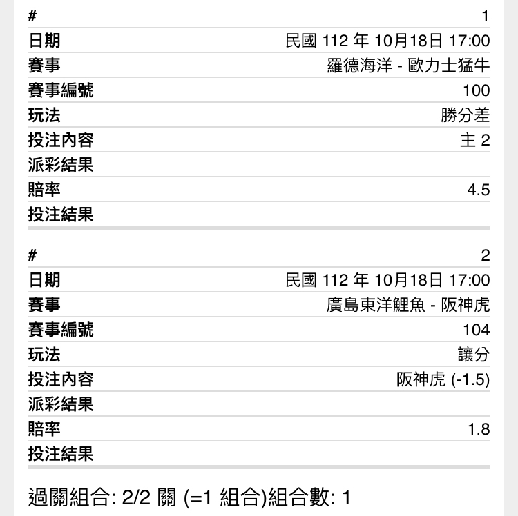 推 jjking404: 幹原本要買羅德單大虎單大 結果睡過頭 42.76.42.116 10/18 19:40
