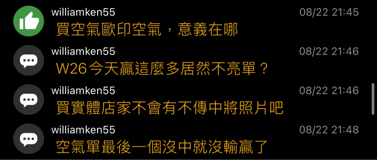 williamken55: 不過你的單我在live文裡倒是一張都 39.9.161.136 08/23 15:13