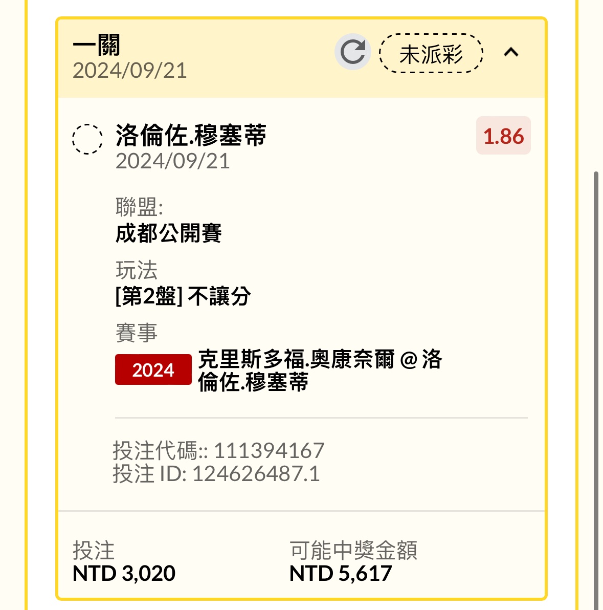 推 Taiwan007: 第一局musetti,1.73,3000223.138.73.33 09/21 16:47