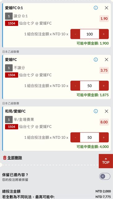讓分 0:1 愛媛FC 1.9