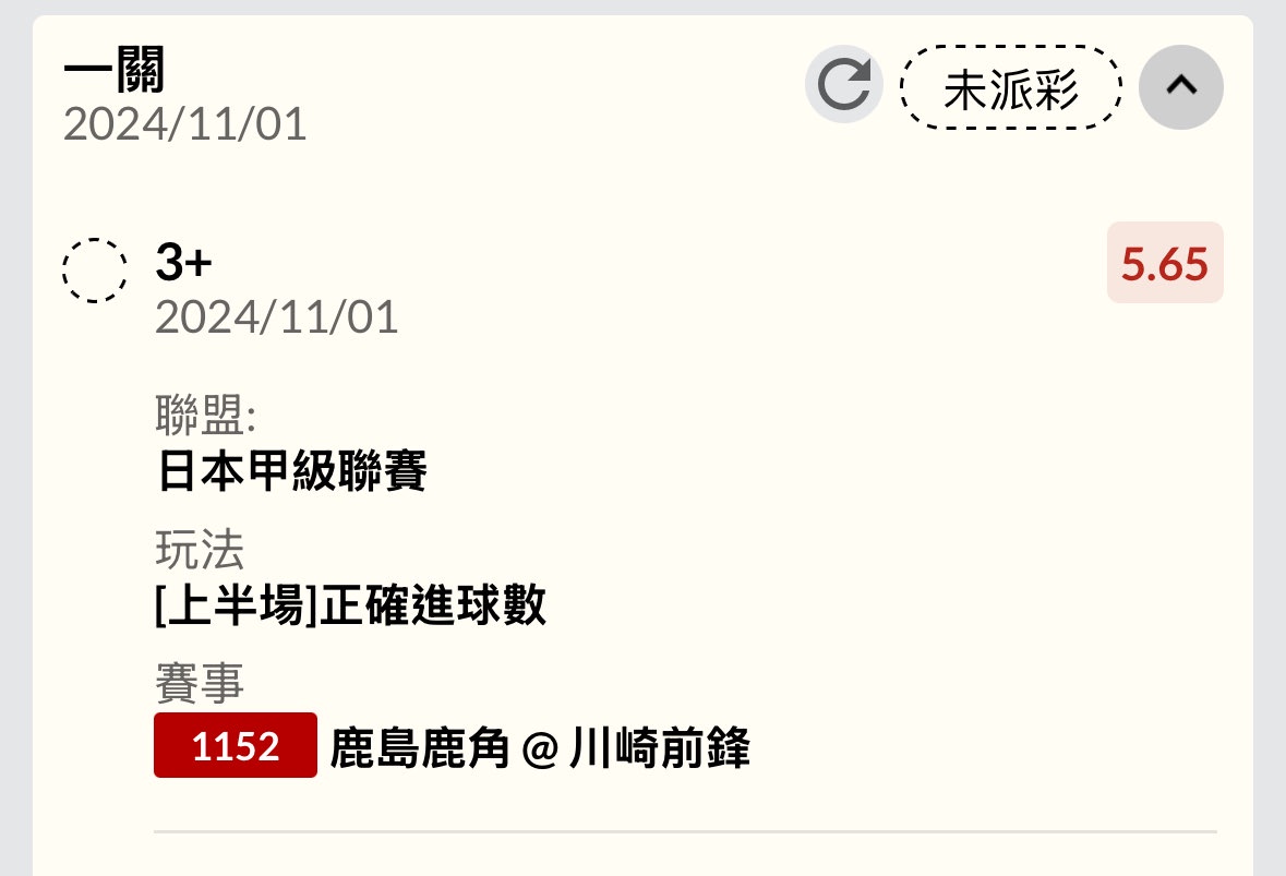 鹿島鹿角:3(10‘,18‘,28‘) 川崎前鋒:1(90+2‘) 怎麼演 ----- Sent from JPTT on my iPhone -- ※ 發信站: 批踢踢實業坊(ptt-club.com.tw), 來自: 101.136.221.162 (臺灣) ※ 文章網址: https://ptt-club.com.tw/SportLottery/M.1730454732.A.4E5