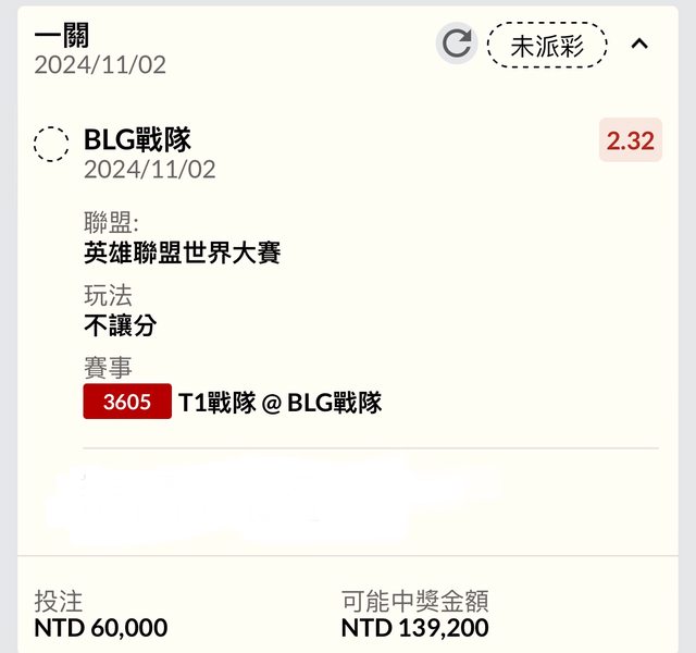 T1 @ BLG 簡單分析 上中野個人認為55開 姑媽狀態絕好 自己本身身邊朋友都看好T1 但我認為Elk身為凱莎人柱力,若BLG封鎖剎雅,應該有能力與之一戰,這個賠率小弟願意 衝一波 身為10年T1粉 T1贏笑著恭喜肥客,T1輸流著眼淚收錢 明天早餐升級鮮奶茶 硬單慎跟 僅供各位參考 推薦 BLG 不讓分 2.32 李哥拿五冠跟我拿8萬 殘酷二選一 https://i.imgur.com/BrwBtv1.jpeg