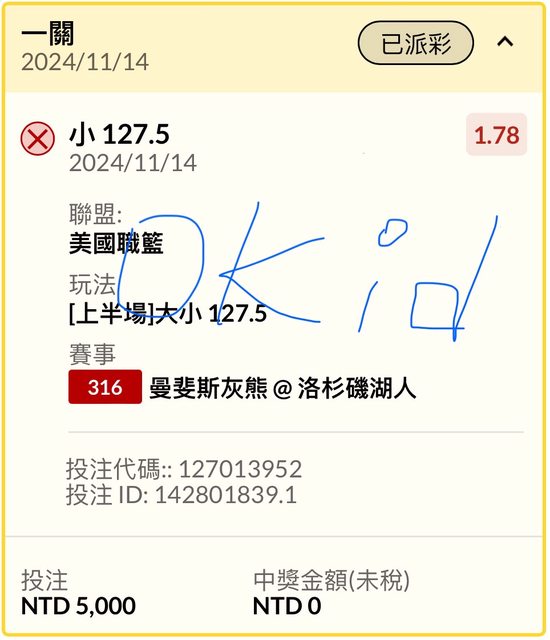 我以為我買到半場128.5小 結果半場最後罰球完64-65 我以為倒了,去看怎麼沒派彩 才發現是買到湖人128.5小 Q4最後犯規戰術差點刷爆停在128極限收! Q4中間有再補一張湖人124.5大也過 https://i.imgur.com/BRGmKwW.jpeg