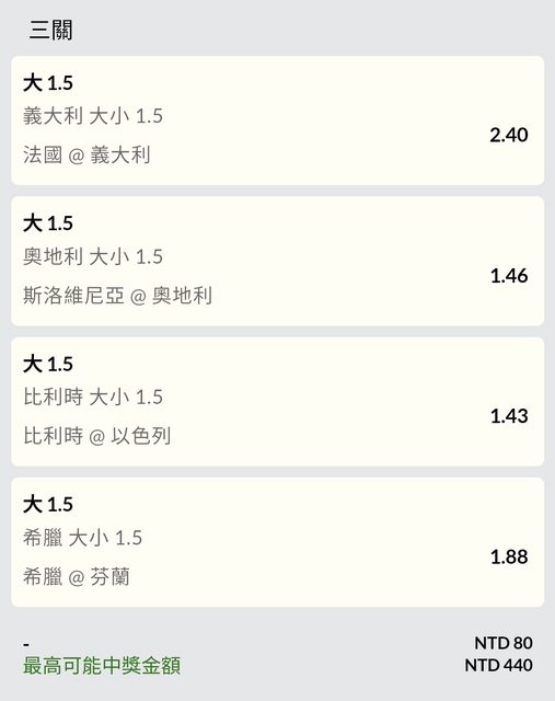不看10點場 以及挪威跟英格蘭都開3+ 所以買剩下四場的上盤1.5大套餐 過三關$20×4 全過$20 http://i.imgur.com/bGnae35.jpg