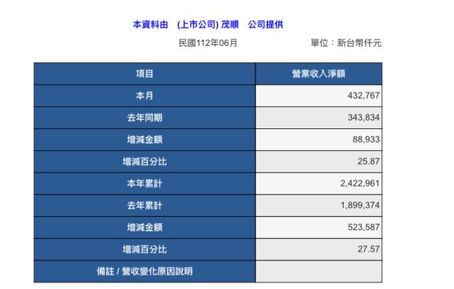 標題[情報] 9942 茂順 6月營收