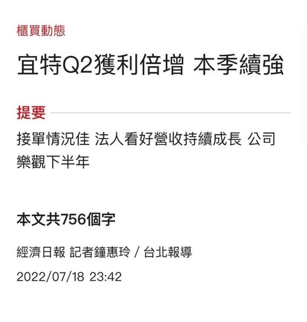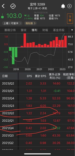看完上圖後 你會發現….去年空頭年,消費性電子這麽差,科技業都在調庫存,結果這個上半年財報 ,已經賺了整整的2021年的2.02元了……是發生什麼事? 那時宜特的股價在56元左右。 https://i.imgur.com/HgphIv2.jpg
