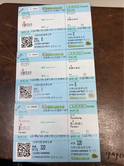 物品2:統聯客運 台北-台中 車票3張