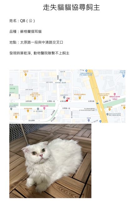標題[協尋] 台中撿到貓貓 協尋飼主