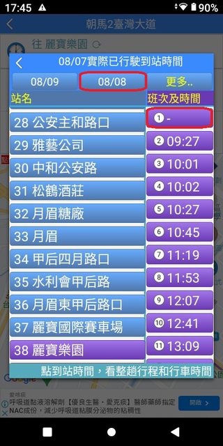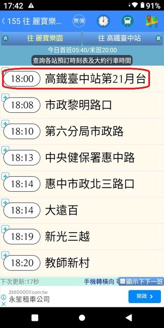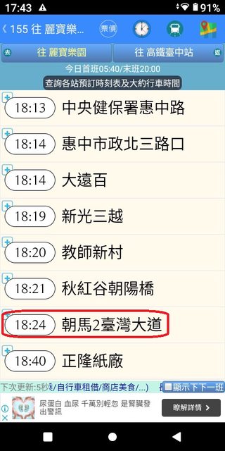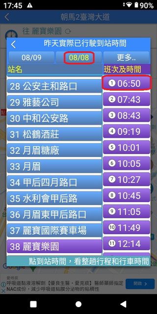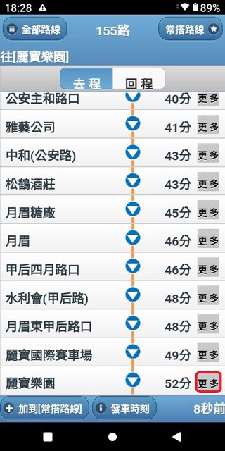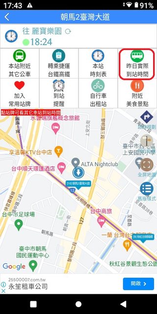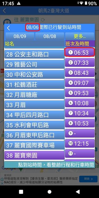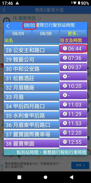 朝馬 6:03 麗寶 6:51 加減得知朝馬到麗寶,約48分鐘。 3.複雜版APP--台中公車何時來