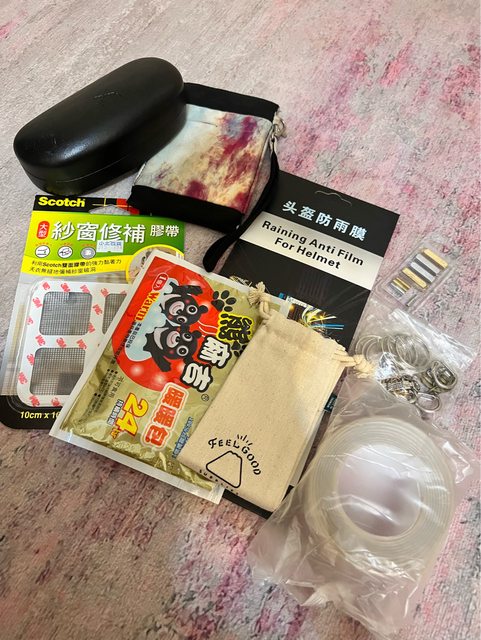 物品名稱:眼鏡盒、手機袋、安全帽防雨膜、鞋帶金屬頭、紗窗修補膠帶1個、暖暖包1個