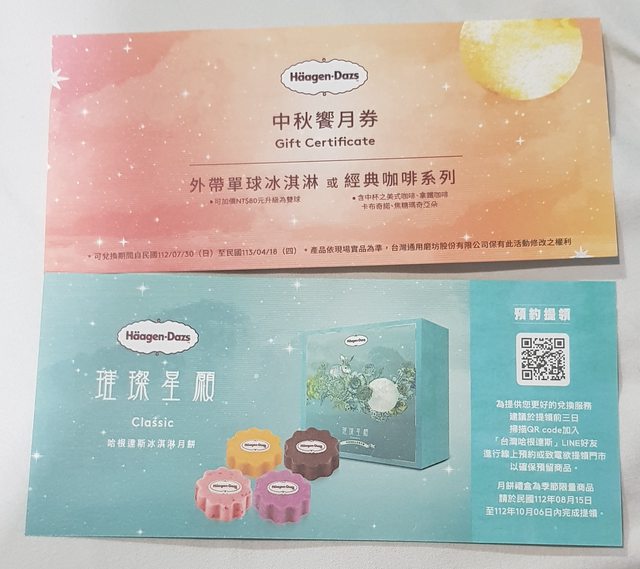 交換項目:哈根達斯冰淇淋月餅璀璨星願*1張+中秋饗月券*1張