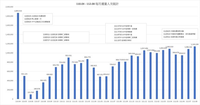 110年4月後每月運量人次統計: