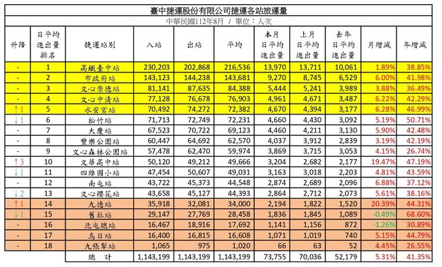 標題: [情報] 台中捷運112年8月各站旅運量