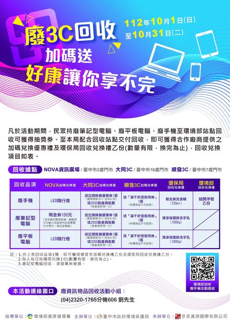 板電腦等3種廢資訊物品,交付至台中市25處門市回收,享有店家專屬優惠,包括現金券及L