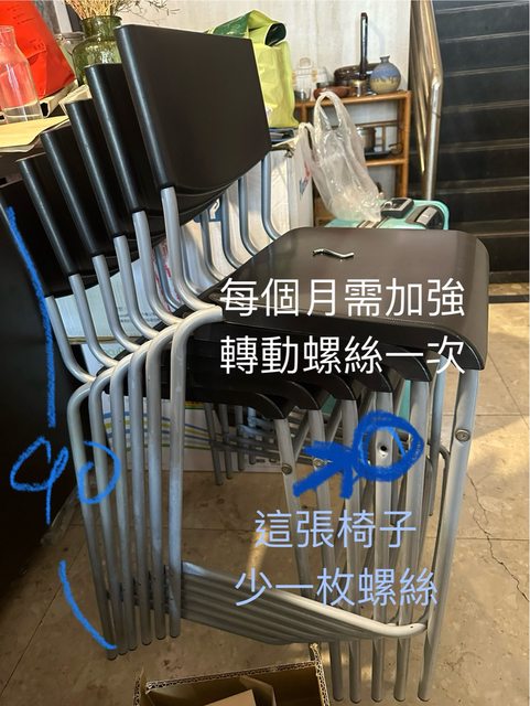有一個椅子少一邊的螺絲,但不影響使用。大概一個月需要鎖緊一次,會附上工具