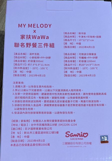 家扶Wawa x My Melody 聯名野餐三件組(不含餐券)售$280/組,有4組