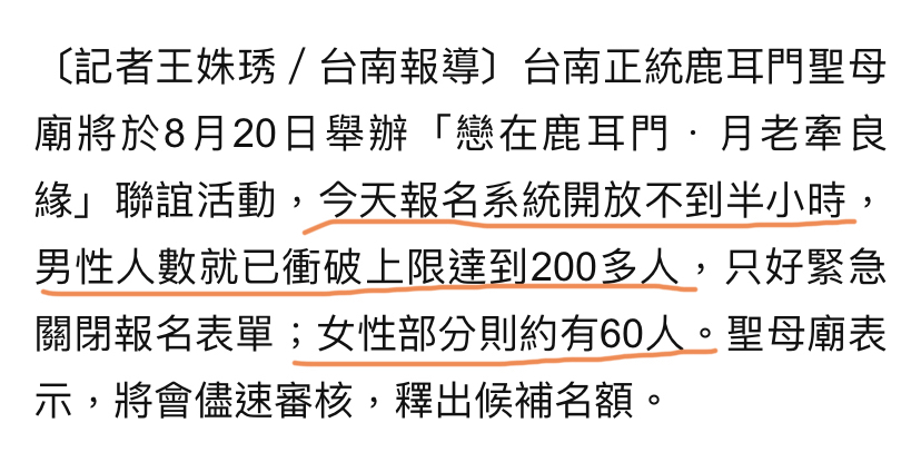 標題[新聞] 台南8月續辦七夕單身聯誼 將加強資格審查