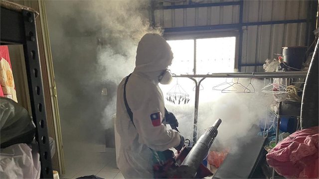 防疫人員進行個案居住地及工作地戶內外化學防治作業。