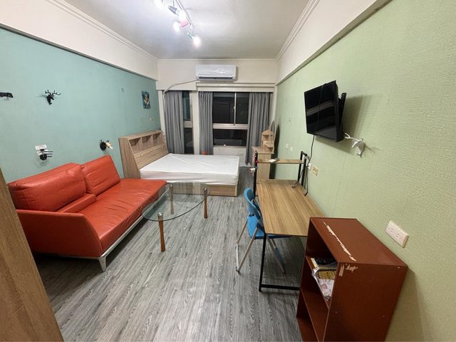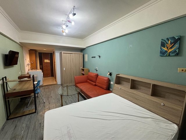 【房間配置】:雙人床(含床墊與保潔墊)、床頭櫃、衣櫃、書桌、椅子、電視(目前無