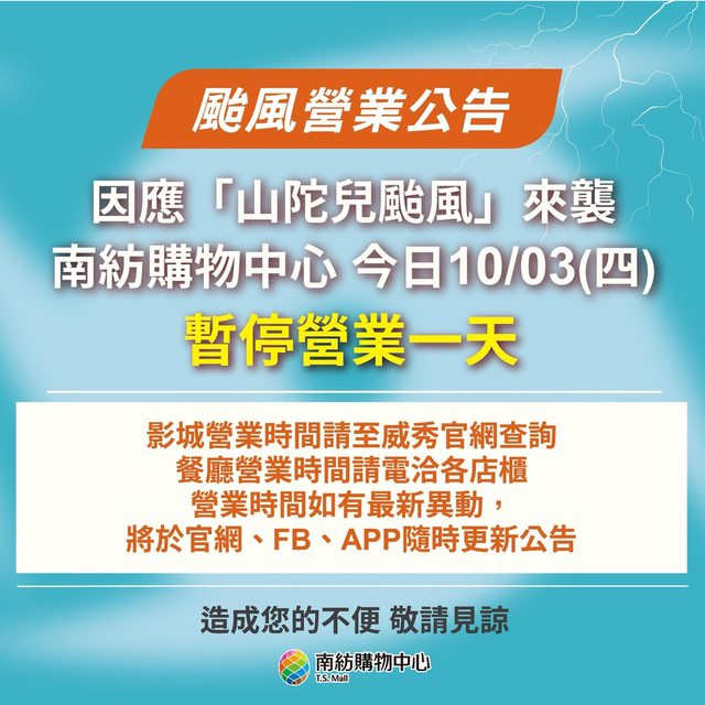 → baychi999: 南部百貨全放了 只剩賣場有開 10/03 10:29