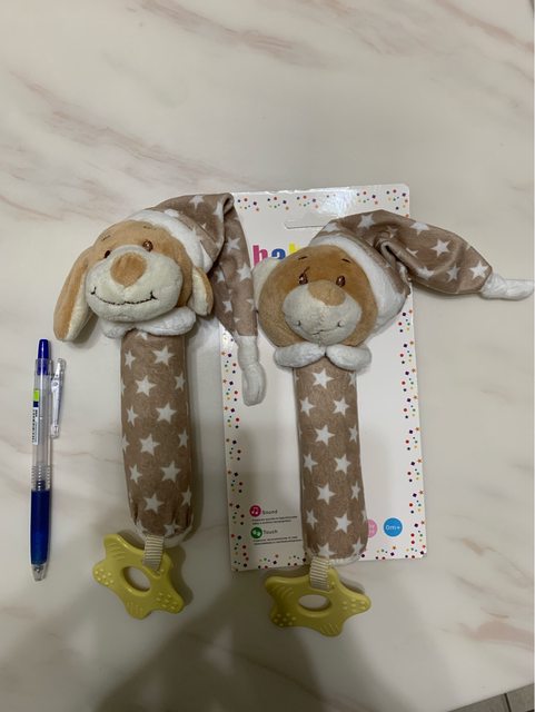 全新,狗(無紙卡)、熊各1,按壓身體有啾啾聲跟響紙沙沙聲響。