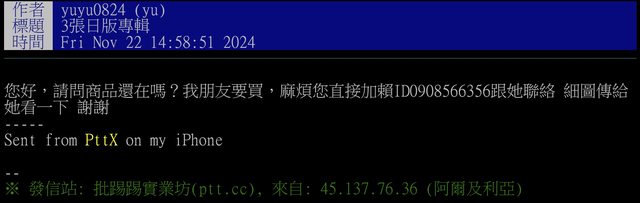 → kamato319: 我也收到,叫我寄貨到付款到宜蘭給他!都發在台南版了 11/22 21:46