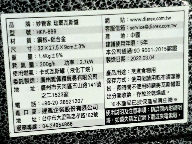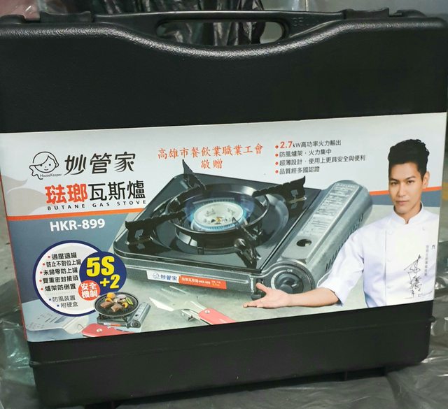 <已售出>10.全新妙管家琺瑯瓦斯爐200元 2022/03/04製,有餐飲工會敬贈字樣,包裝紙有裂痕,全新未使用。